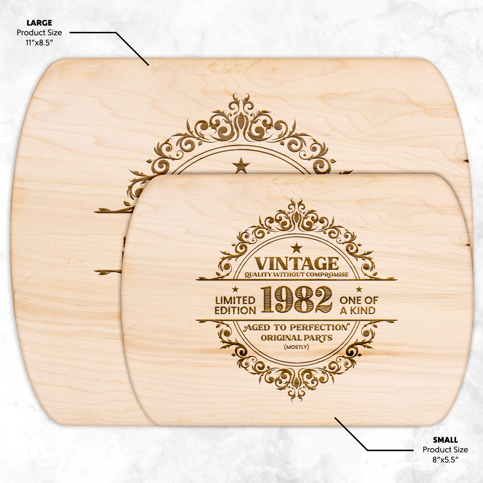 Crafted from premium American maple or walnut hardwood, each board flaunts its bold natural grain and a crisp, luxe engraved design.